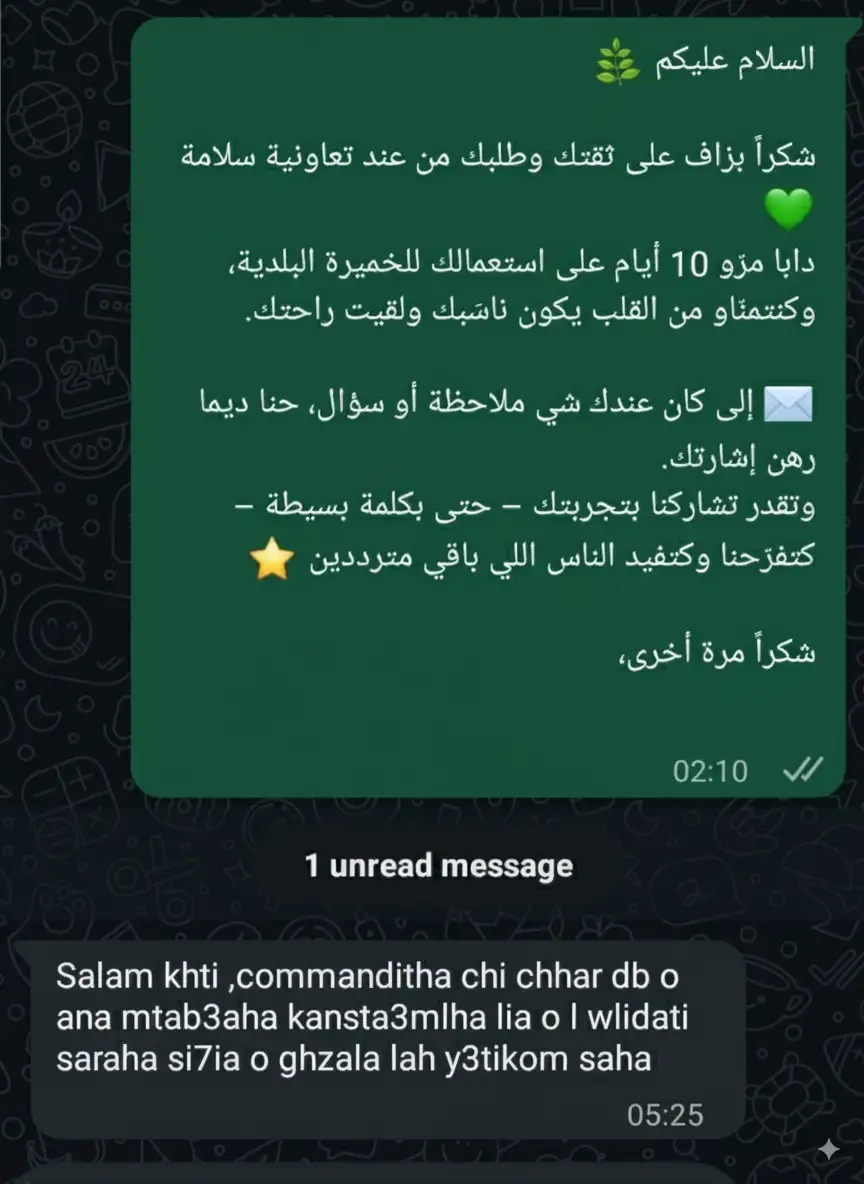 Salam khti ,commanditha chi chhar db o ana mtab3aha kansta3mlha lia o l wlidati saraha si7ia o ghzala lah y3tikom saha